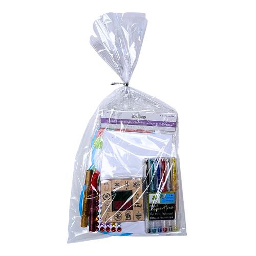 Kit comes with: Card & Envelope Set, gel pen set, Christmas sticker book, peel n’ stick jewels, wooden Christmas stamp set with ink and a glitter glue tube!